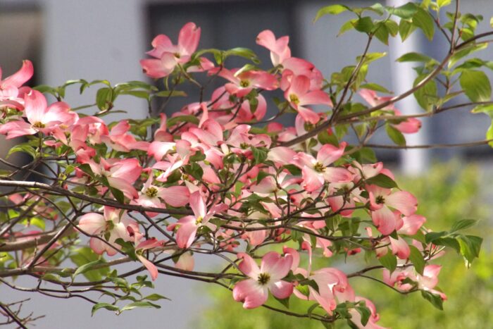 ハナミズキ、やわらかな春の光に包まれて、街角をやさしく彩る花。