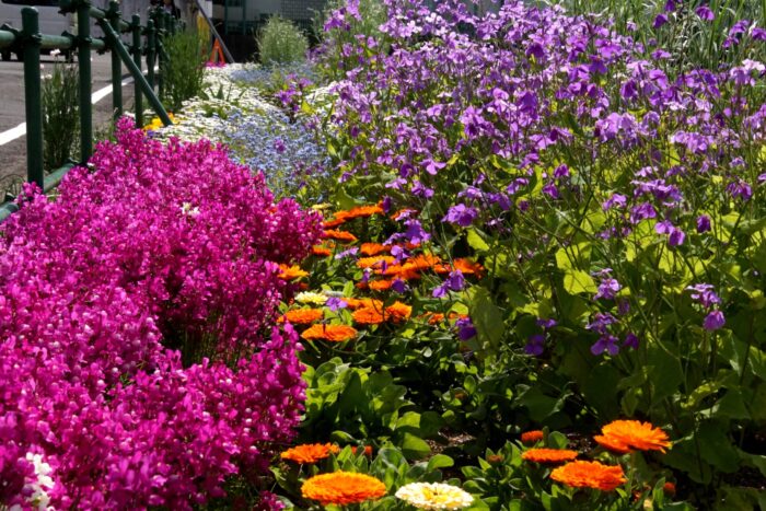 町内会花壇、花の会の皆さんの手で育てられた花々が、通りを明るく彩っています。